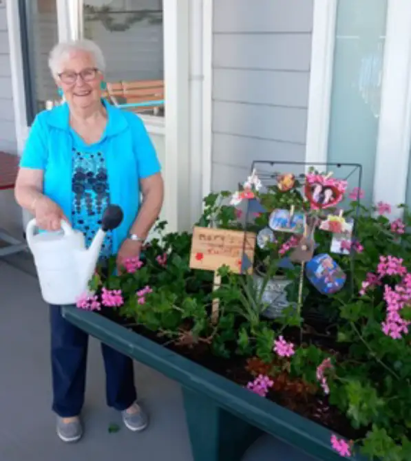 Samen met een vrijwilliger heeft Marg haar tuintje al meermaals ingericht met bloemen van het seizoen en tomatenplantjes. Elke dag is Marg bij haar tuintje te vinden. Ondanks haar leeftijd en de fysieke uitdagingen die daarmee gepaard gaan, zorgt ze nog steeds met liefde en aandacht voor haar planten. Het zien opbloeien van haar bloemen en tomaten geeft haar enorme voldoening. Met trots oogst ze de tomaatjes uit haar tuin.